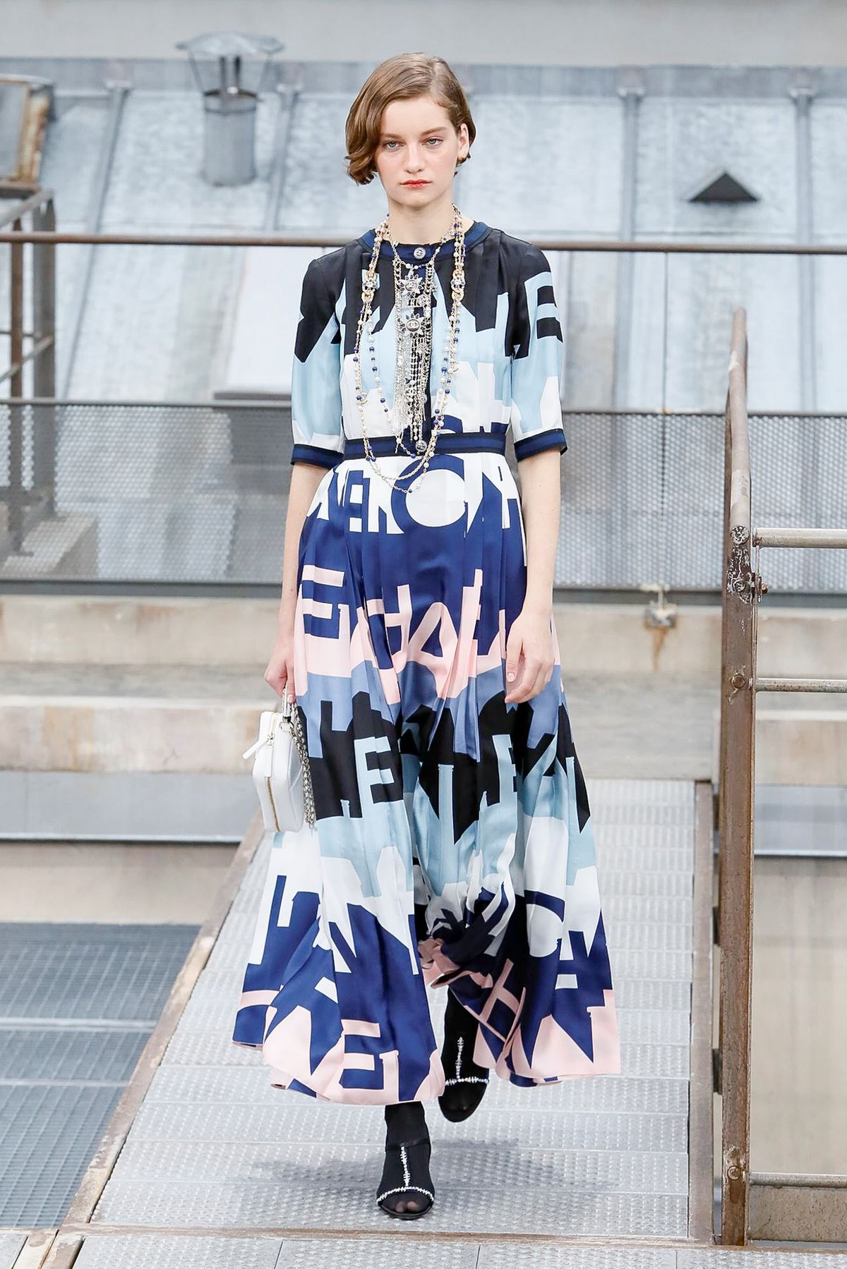 No look acima, a logomania aparece em uma releitura: o nome Chanel é o que faz o grafismo do vestido.