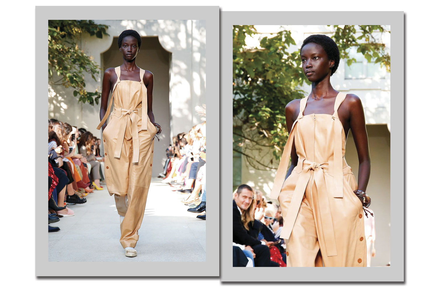 Melhor peça da passarela da grife, o macacão com amarrações tem detalhe de botões nas calças. Aquela peça que fica para o resto da vida!