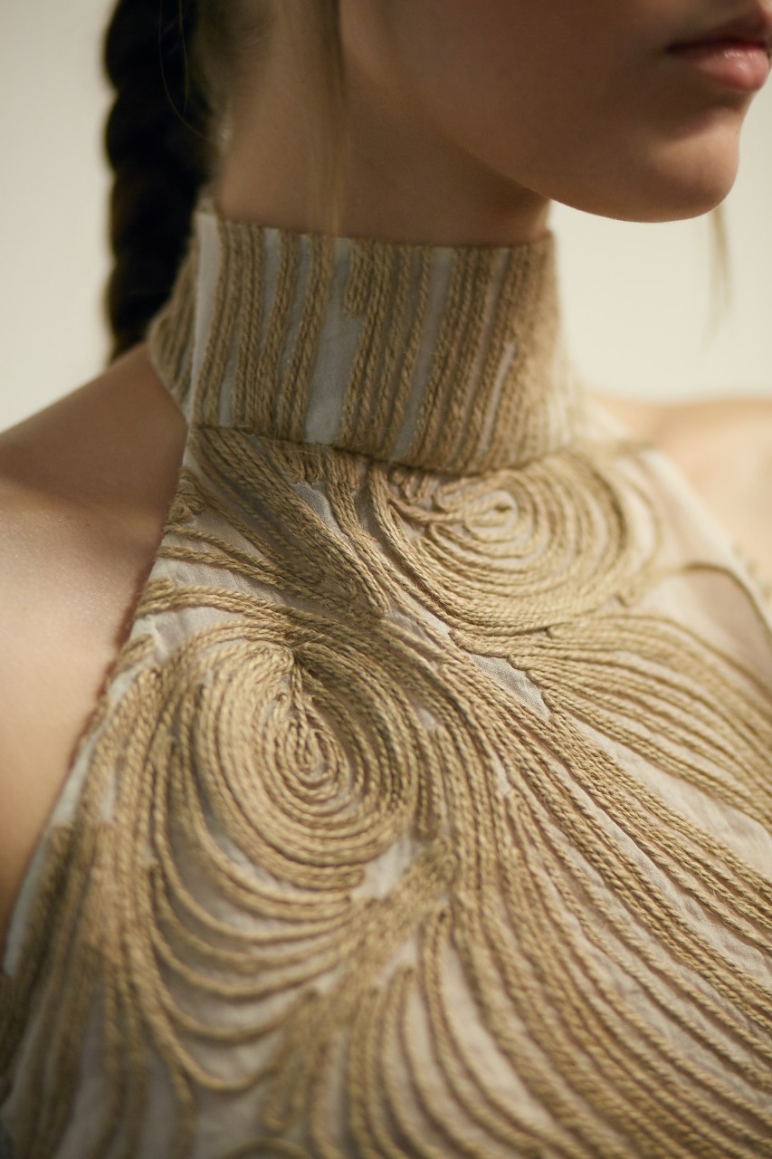 O soutache também foi escolhido para adicionar grafismos às roupas de Lenny. O mood rústico do material foi equilibrado com a finesse do desenho orgânico da estampa. E o fundo nude foi escolhido para arrematar a peça cropped.