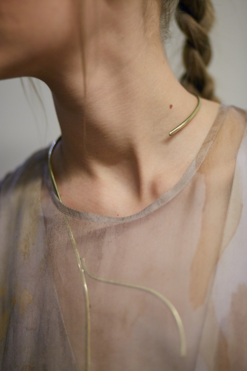 Pulseiras e colares dourados fecharam alguns looks do verão 2020. A dica, desta vez, é colocar a ponta do colar por dentro da gola transparente, o que proporciona ainda mais um tipo de grafismo.