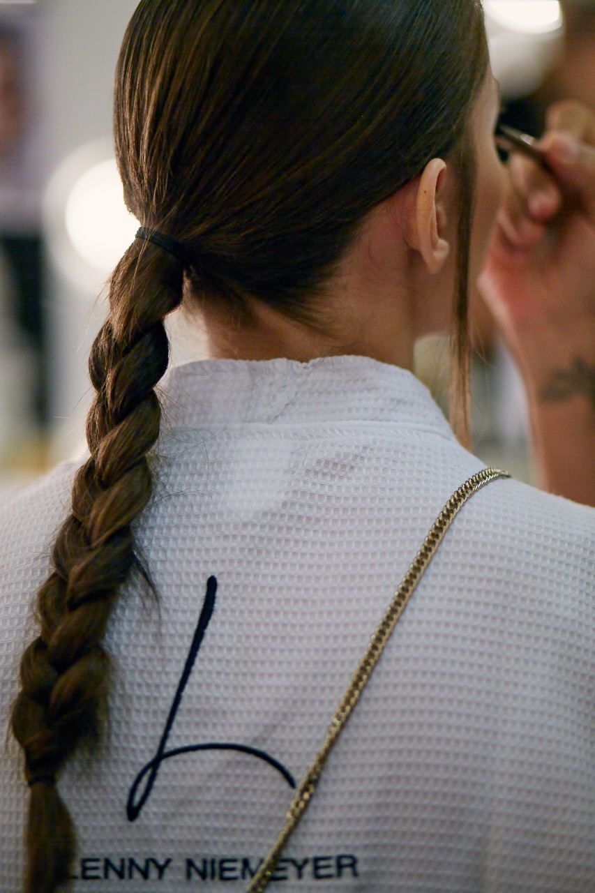 E outro detalhe importante que será a pedida no verão 2020 é a trança. A Lenny Niemeyer preferiu por rabo baixo, arrematado por elásticos pretos.