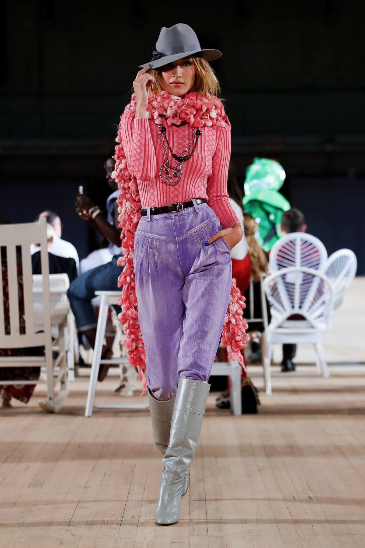 Bella Hadid cruzou a passarela com um estilo misturado entre cowgirl e detetive. Aqui, os acessórios roubam a cena: o chapéu é um must para adicionar mistério ao visual, enquanto o colar de gato é obviamente uma homenagem a Lagerfeld.
