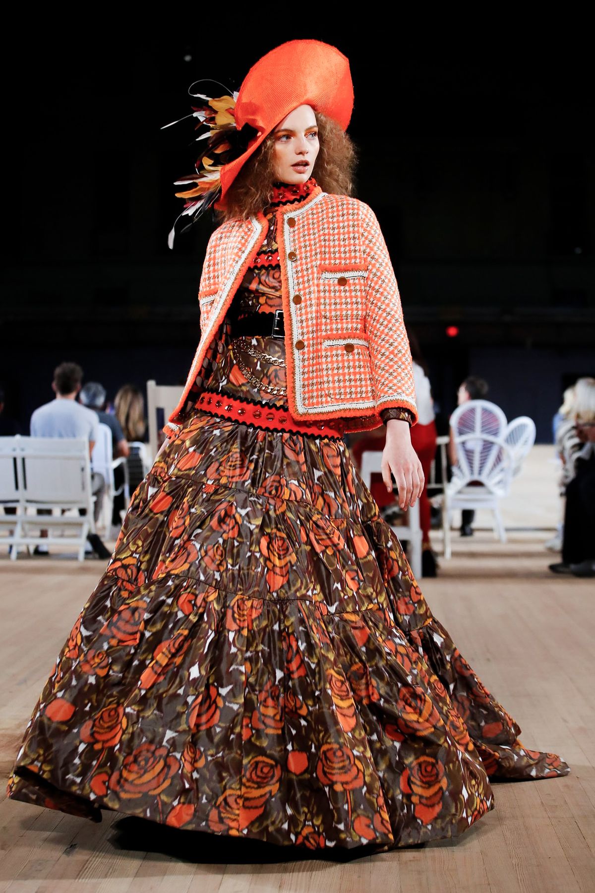 Um dos melhores looks do desfile de Marc Jacobs, o tweed laranja combinado com a saia longa de flores é um must-have.