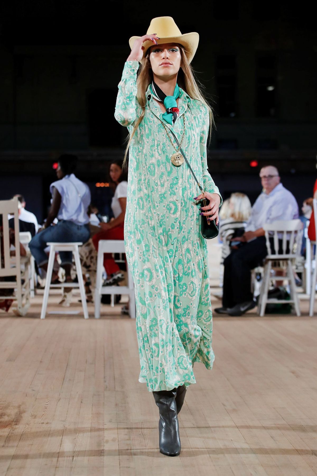 Voltando para o estilo cowgirl, o chapéu arremata o visual construído pelo vestido fluido de algodão.