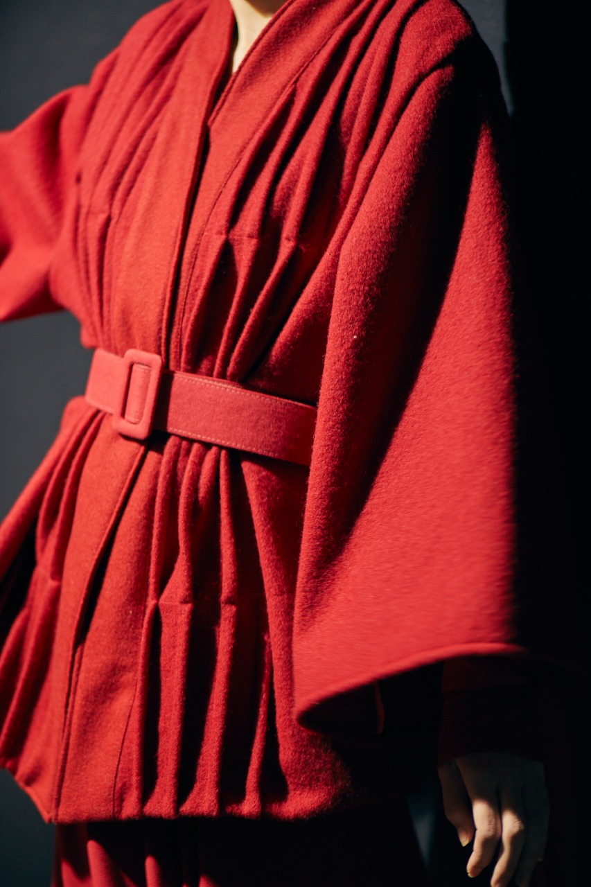 O tecido todo trabalhado no plissado em diferentes direções e tamanhos enriqueceu a coleção de alfaiataria.
