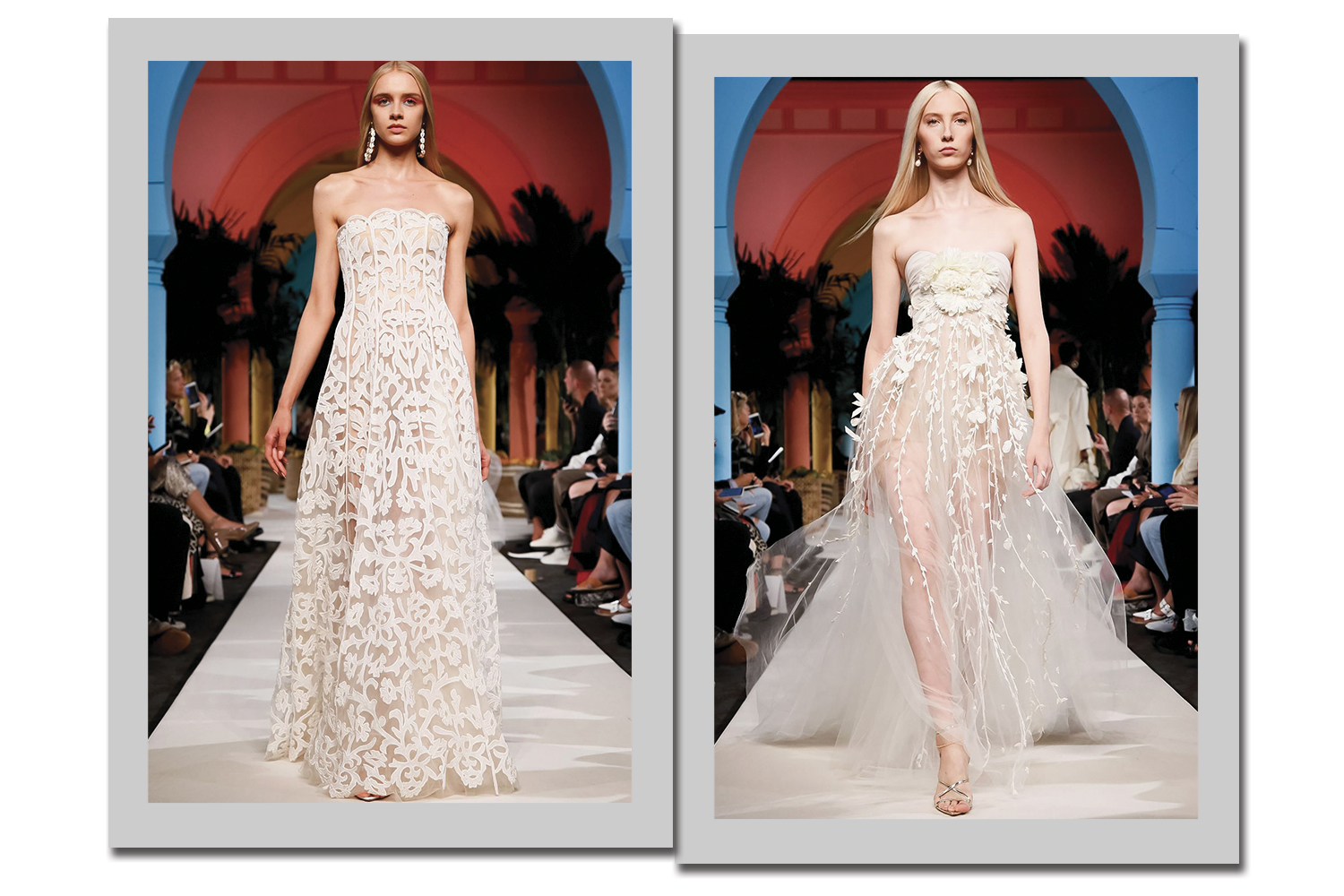 As noivas também marcaram presença no verão 2020 da Oscar de La Renta. Aqui, a transparência predomina.