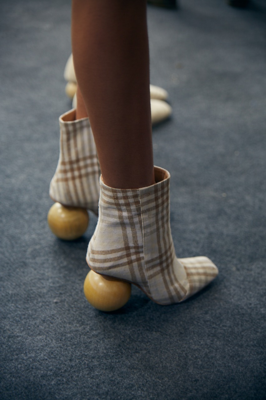 Os sapatos, da Manolita, foram feitos com o mesmo tecido da marca e madeira reutilizada.