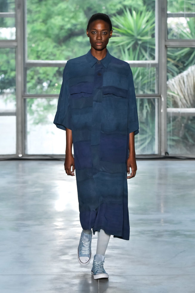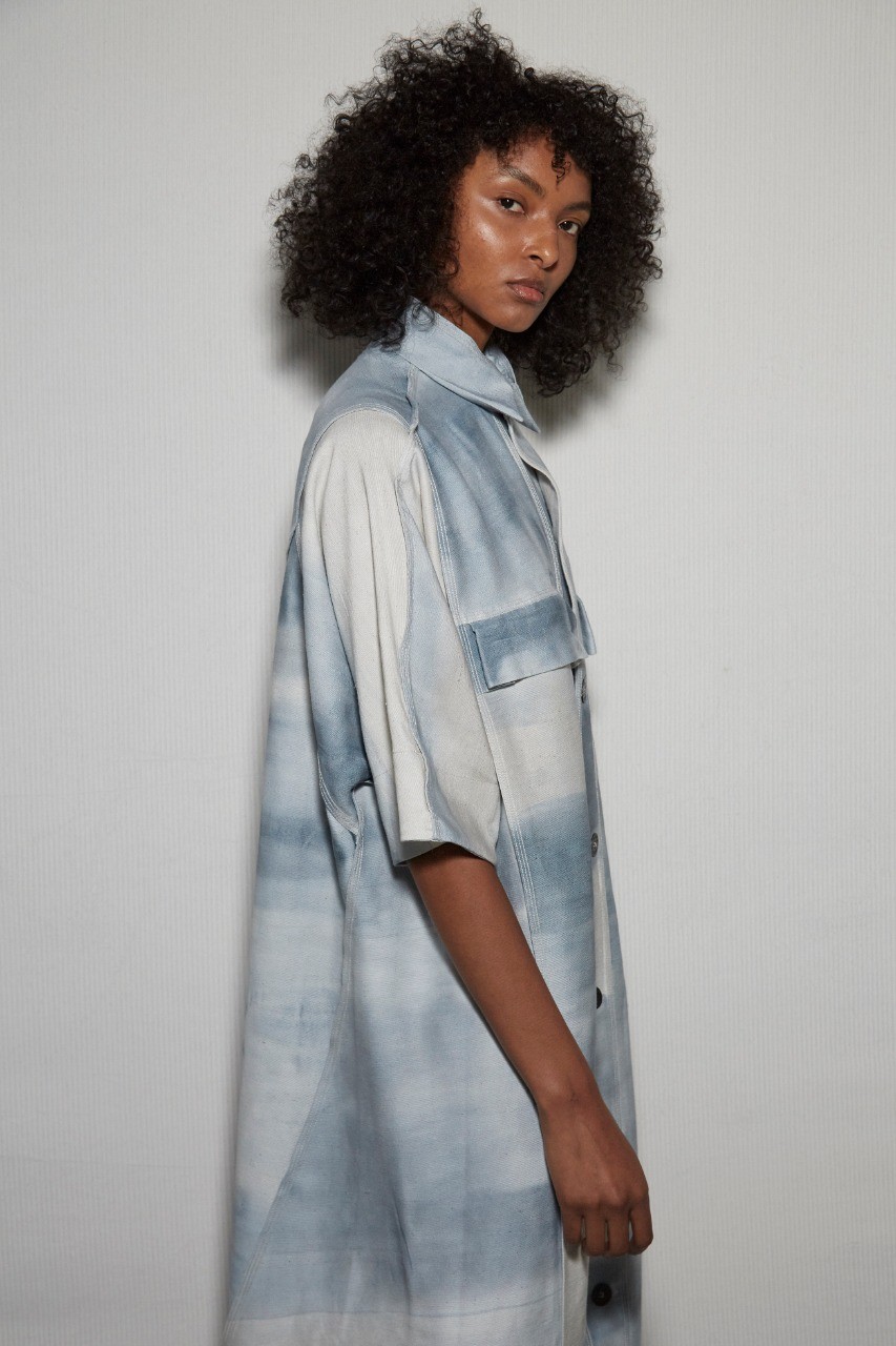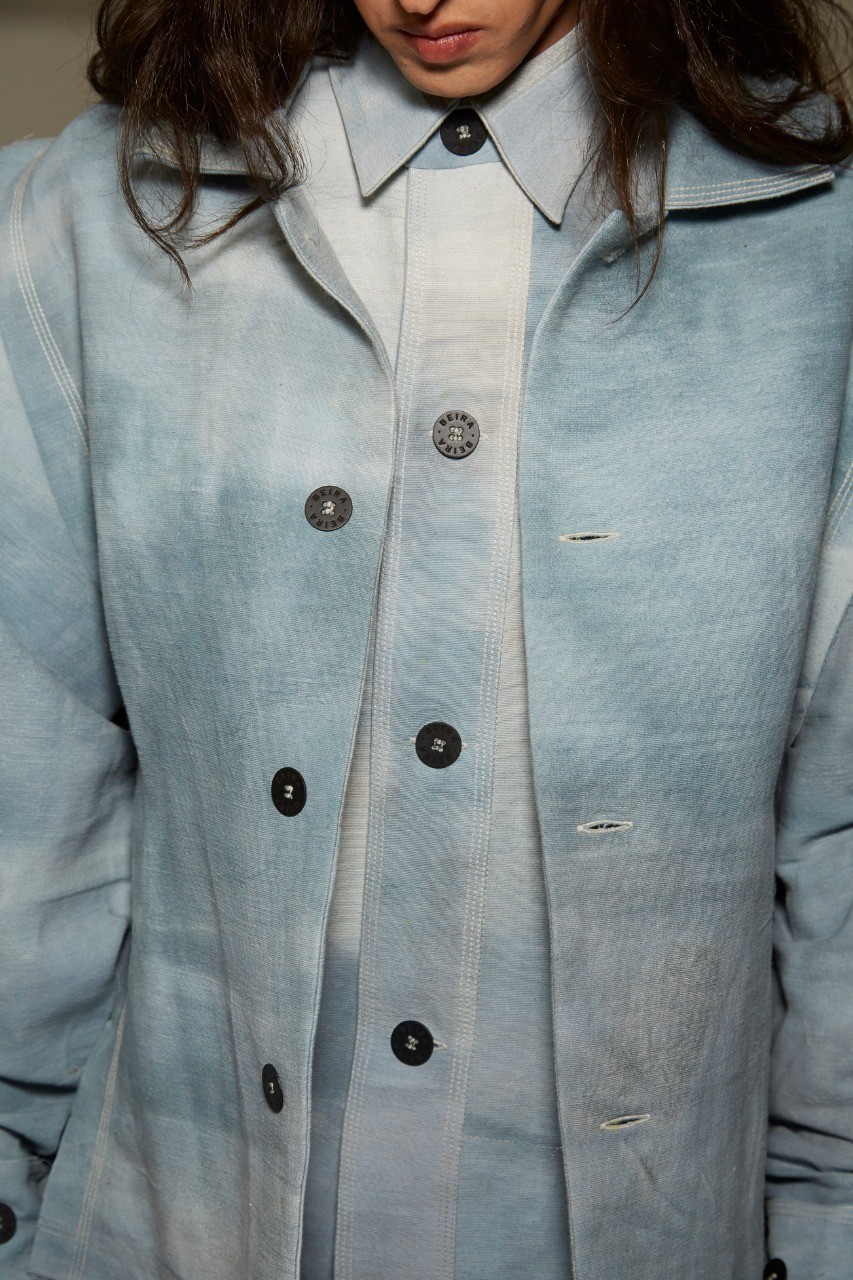 A Beira está toda azul. Depois de uma coleção baseada em tons escuros, Lívia Campos investiu na cor por um motivo muito simples: dar vida aos materiais que já estavam em estoque. As peças, que receberam pinceladas e aquarelas brancas, também variam na textura, por terem sido construídas em algodão, seda e poliamida, entre outros materiais.