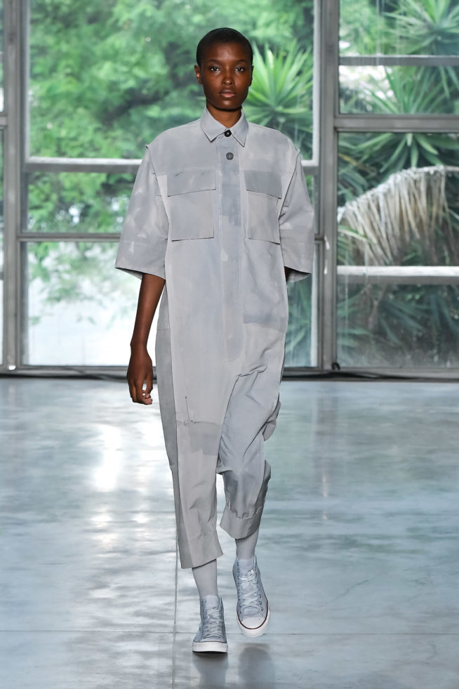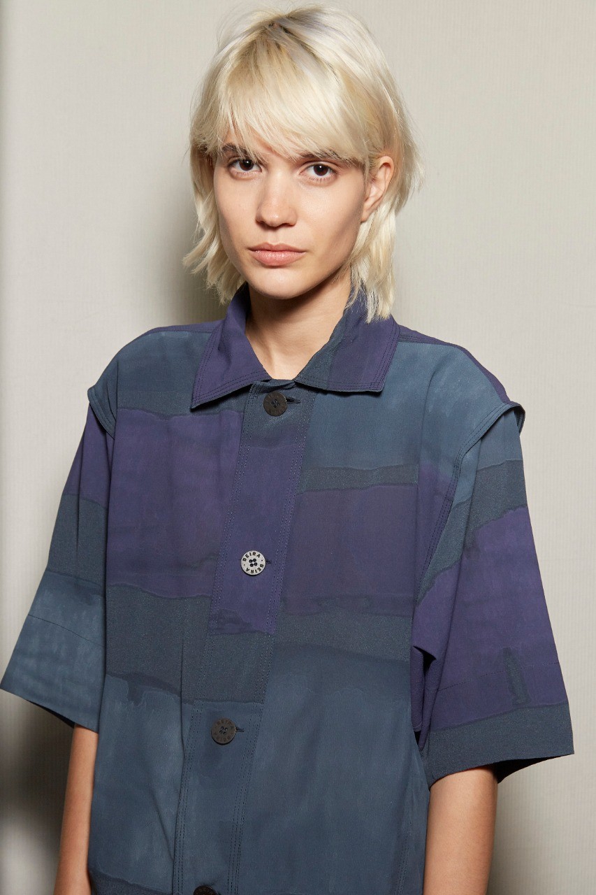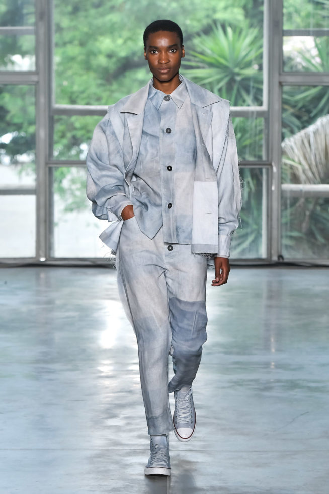 “As formas são sempre um processo que crio ao pensar na próxima calça ou na próxima blusa”, disse a designer sobre a criação do que ela chama de “família de produtos”, por uma peça derivar da outra. Um dos detalhes interessantes da desconstrução da alfaiataria da Beira estão nas costas: as palas foram cortadas em godê e meio círculos, criando volumetria com babados nas camisas e casacos.