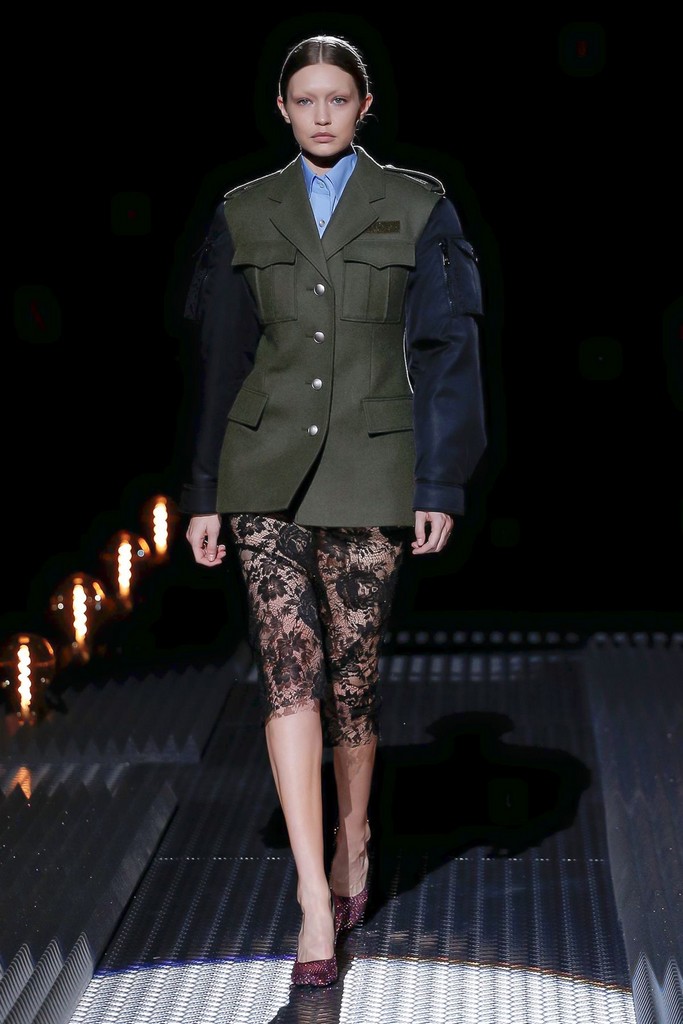 7. O look desfilado por Gigi Hadid, que resumiu as misturas e contrastes apresentados na coleção.