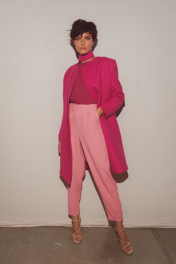 … principalmente nos looks pinks, cor intensa e marcante que foi combinado com rosas mais suaves e tons mais alaranjados. No look acima, a calça mais clara contrasta com a blusa e o casaco mais fortes.