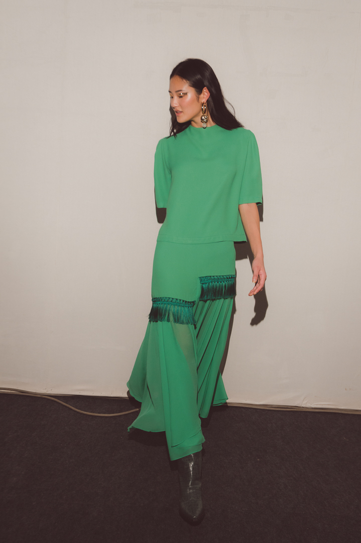 A silhueta fluída ganha peso com camadas de babados de diferentes texturas e franjas curtas aplicadas nas sedas e crepes. Destaque para a bolsa desejo, em shape blocado triangular, em couros texturizados e alça metálica. Veja dez coisas que amamos na nova coleção da Lilly Sarti: