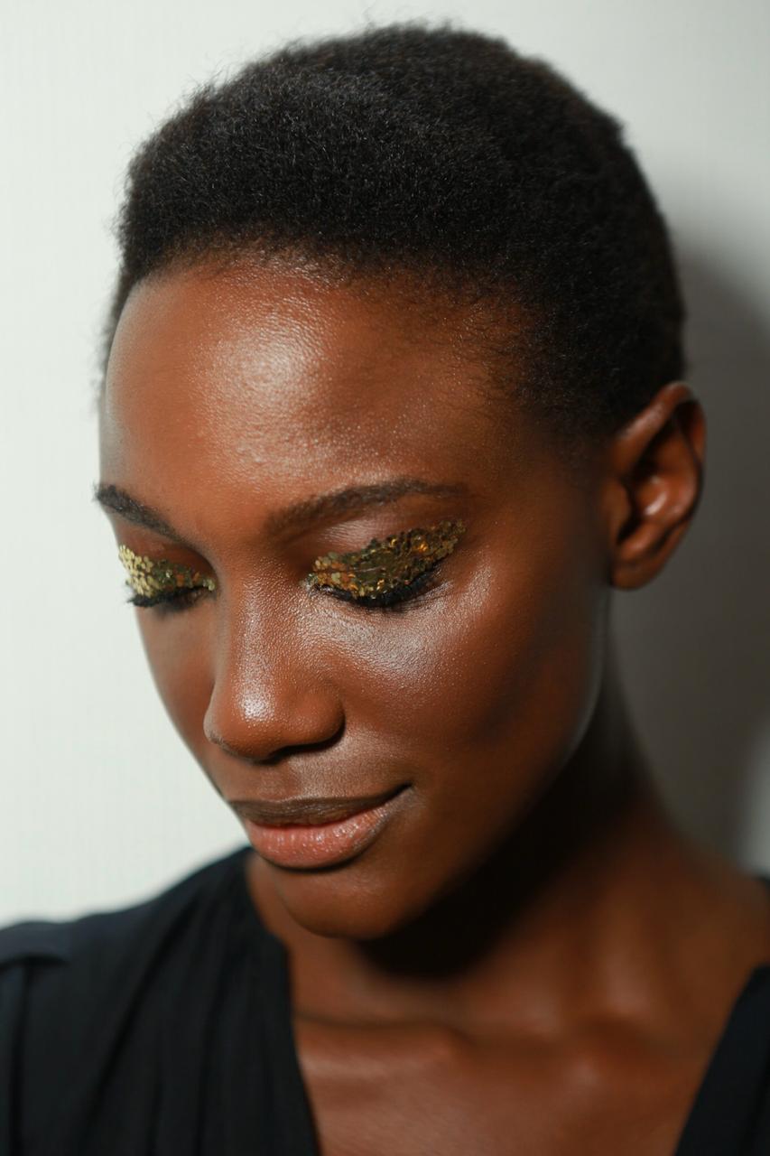 A beleza de Cris Biato para a marca apostou em dois olhares marcantes: um delineado dourado feito com partículas brilhantes – uma espécie de glitter gigante – e um quadrado preto, uma releitura mais leve do delineador comum.