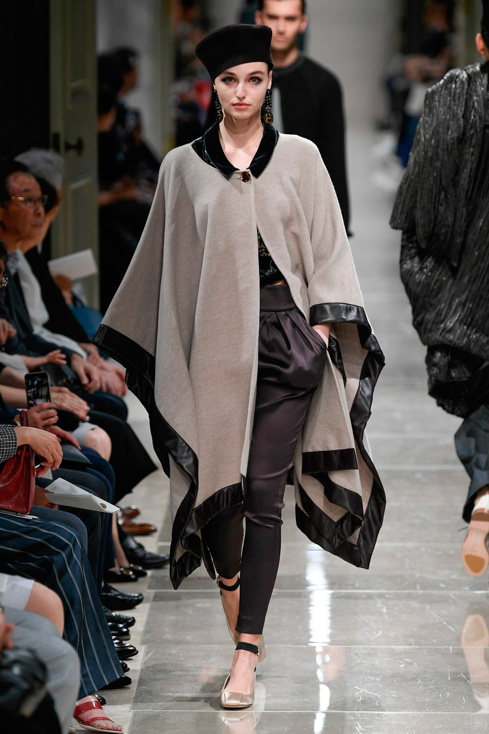 Peça-chave do guarda-roupa hippie dos anos 1970, o poncho está de volta e veio para ficar! O modelo da Armani tem detalhes de couro.