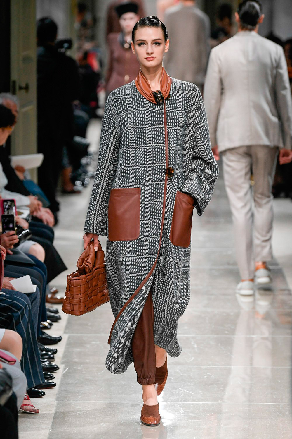 Detalhes em couro são apegada da Armani para o resort 2020. Repare como o material delineia o casaco e também aparece no bolso.