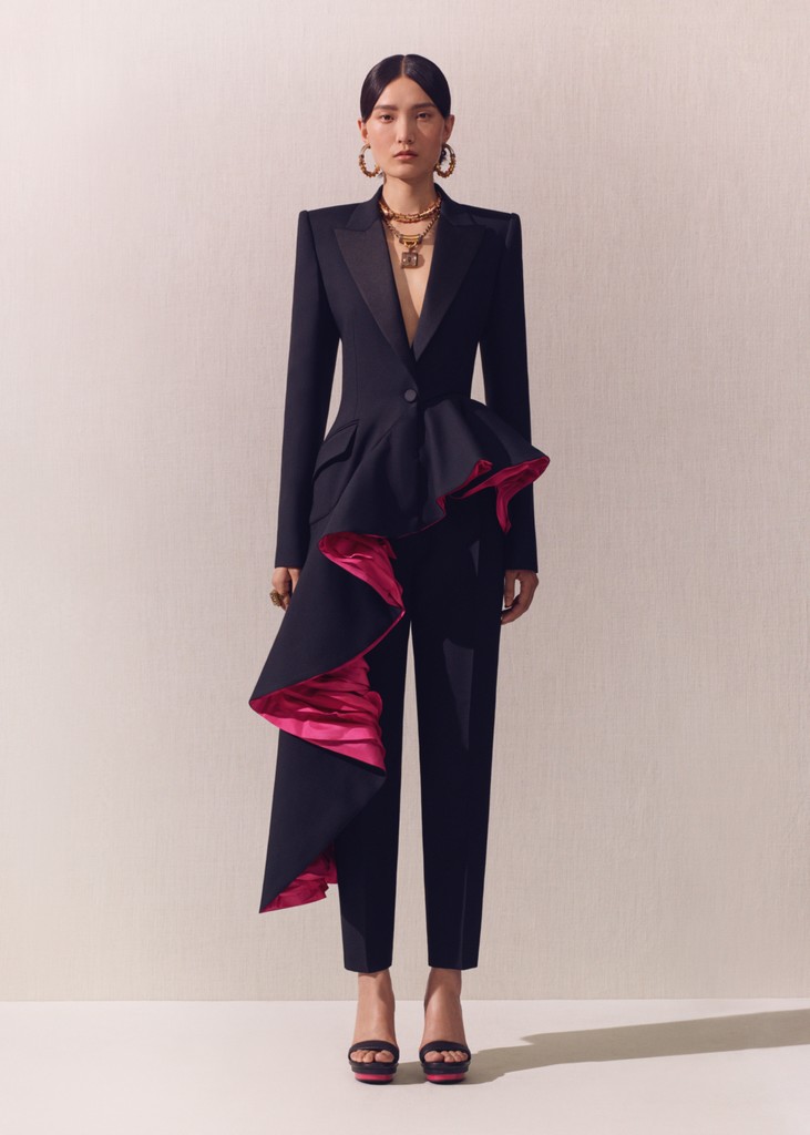 Os contrastes da natureza foram inspiração para a coleção resort 2020 de Alexander McQueen, apresentada nesta quinta-feira (14.11). A leveza de alguns tecidos, como o tafetá, ganha força com os volumes exagerados, os ternos se tornam armaduras com cintos grossos e detalhes em couro e toques de cor em peças pretas são alguns exemplos de como a label criou uma linha que mistura elementos opostos.