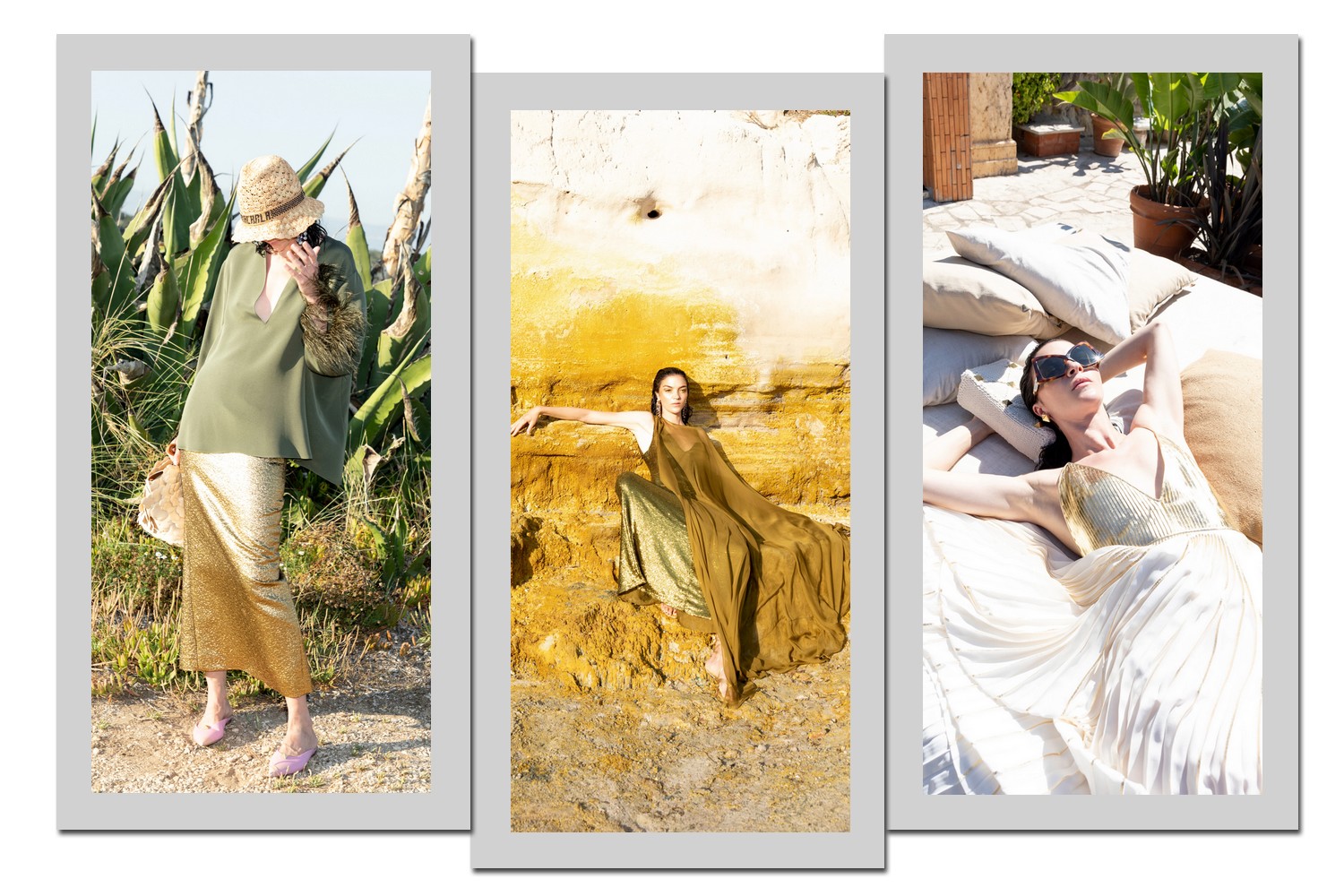 Com tecido brilhante, saias, shorts e vestidos dourados criam um contraste glamoroso tanto com as cores mais vívidas quanto em combinações de preto e branco.