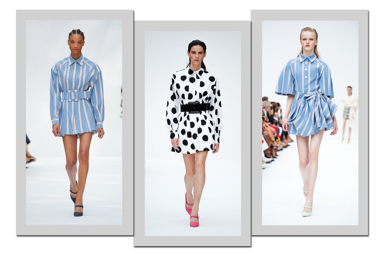 A inspiração no vestuário masculino ficou por conta da representação da camisa de diversas maneiras: transformadas em macacões e vestidos.