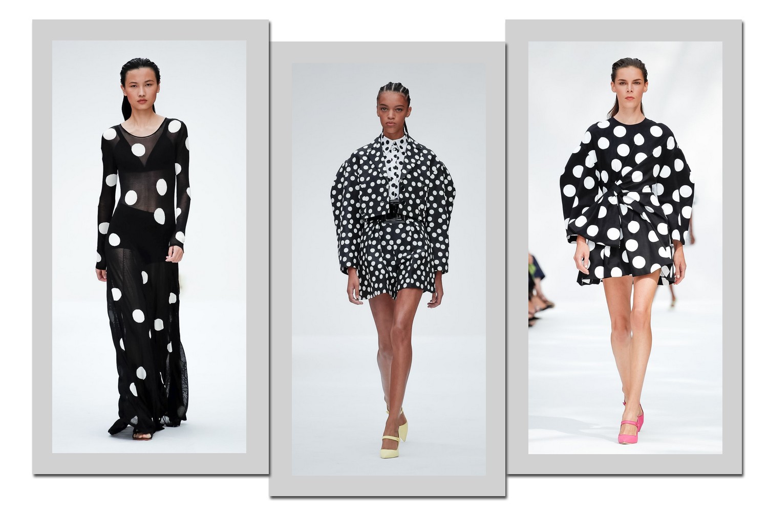 A estampa de poá em branco e preto, marca registrada da grife, apareceu em uma boa sequência de casacos e vestidos e em tamanhos variados.
