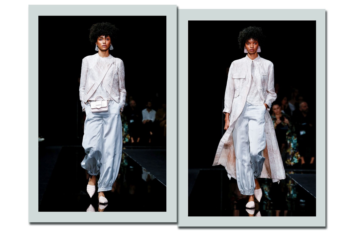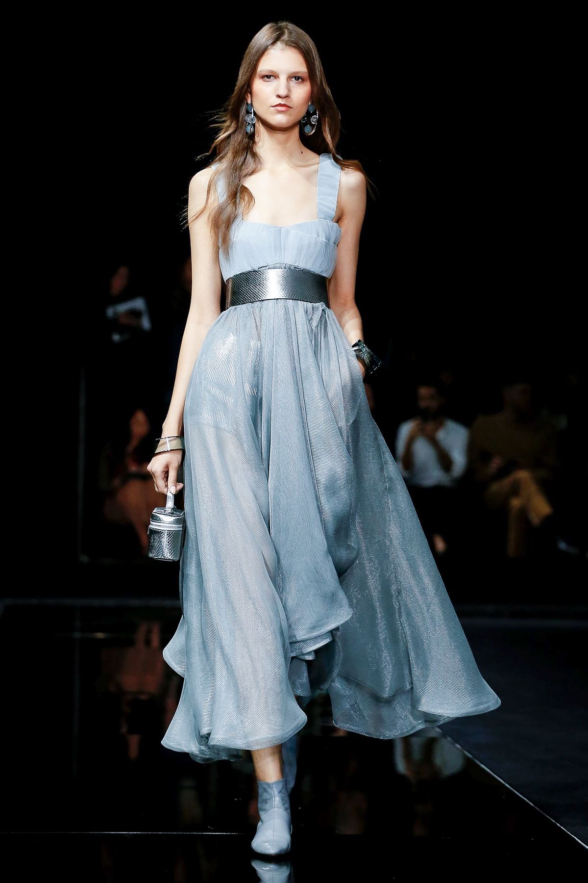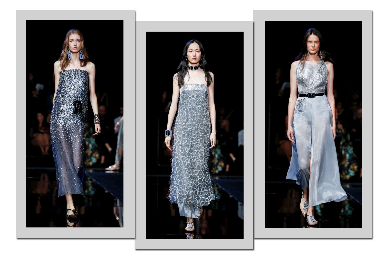A silhueta da Emporio Armani é naturalmente feminina, baseada em linhas clean e sobreposições fluidas. Simplicidade, elegância e qualidade são conceitos-chave. Rosa, aquamarine e azul céu – todos com um chique acento empoeirado – vêm misturados ao cinza em tecidos como seda com textura de papel, veludo e tule bordado, que evoluem para a longa sequência de brilhos acinzentados e prateados em looks casuais e festa.