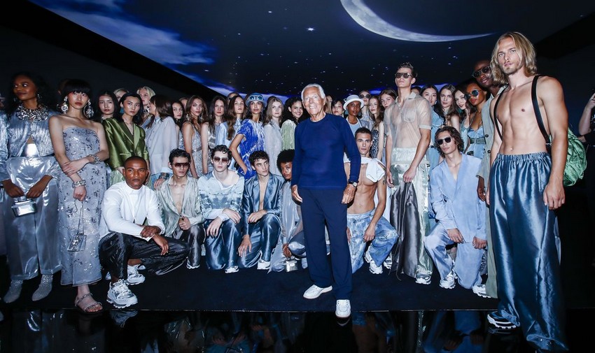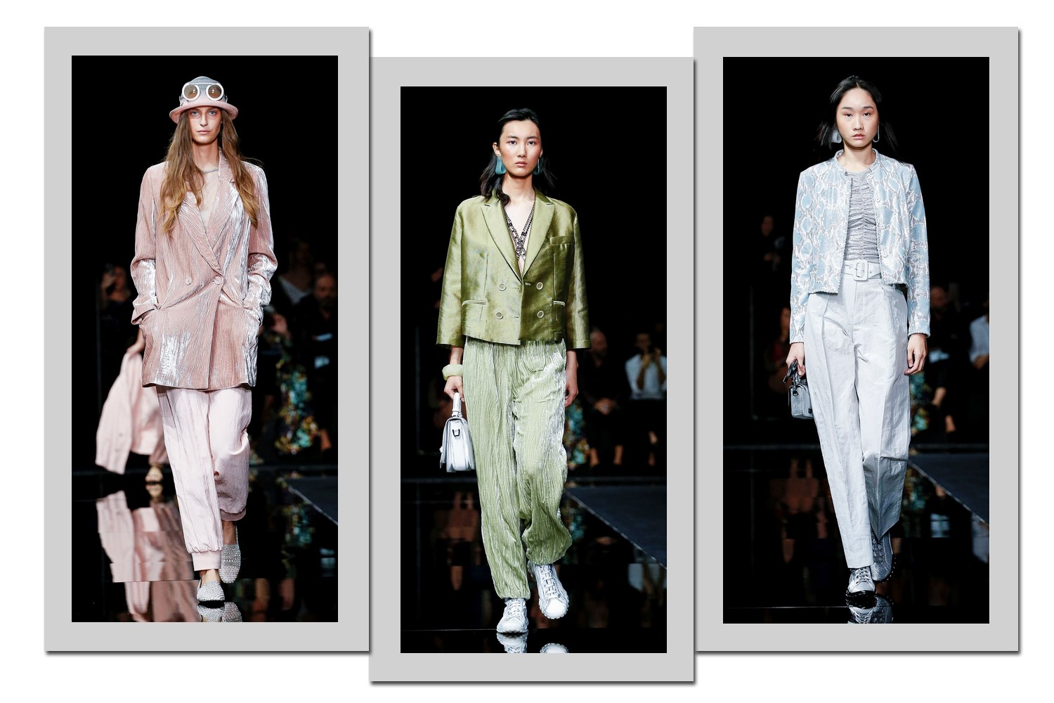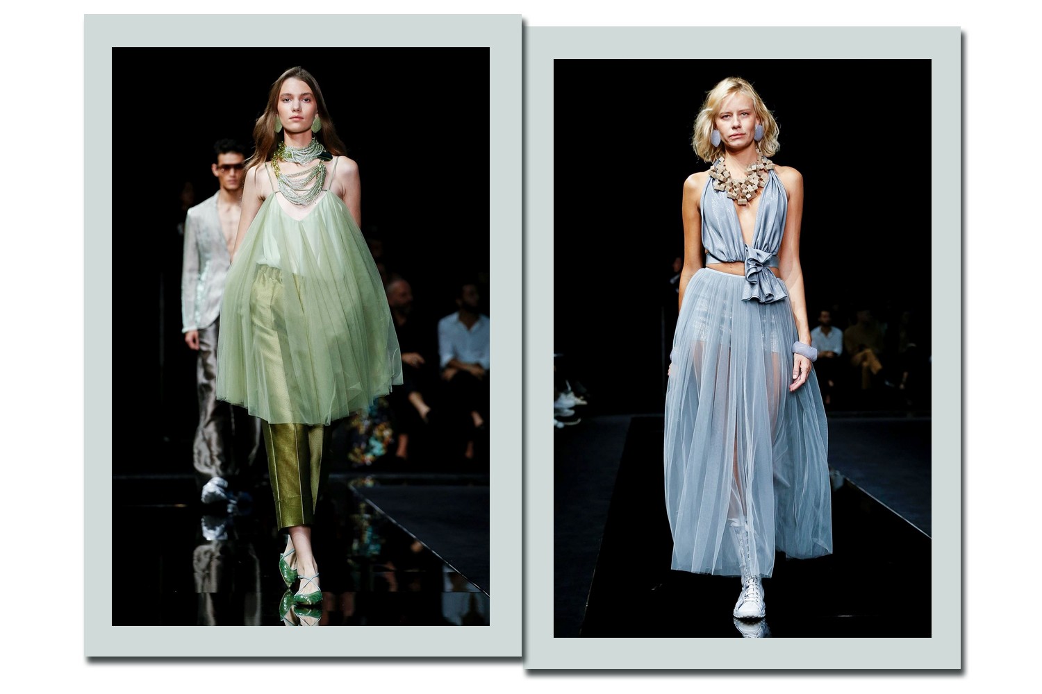 A silhueta da Emporio Armani é naturalmente feminina, baseada em linhas clean e sobreposições fluidas. Simplicidade, elegância e qualidade são conceitos-chave. Rosa, aquamarine e azul céu – todos com um chique acento empoeirado – vêm misturados ao cinza em tecidos como seda com textura de papel, veludo e tule bordado, que evoluem para a longa sequência de brilhos acinzentados e prateados em looks casuais e festa.