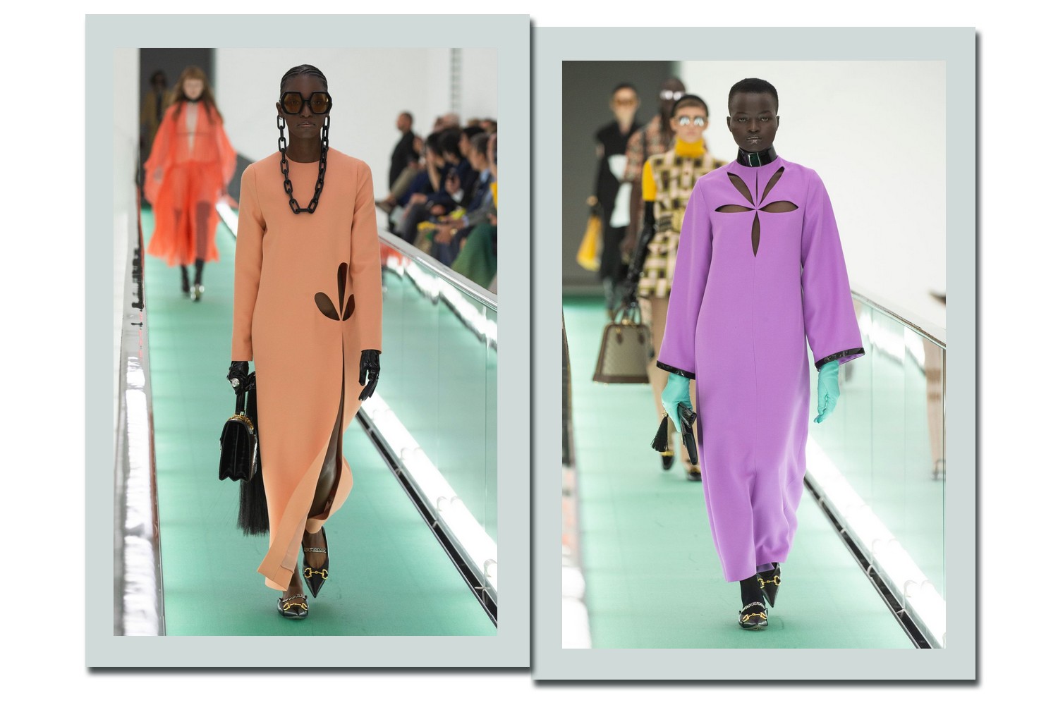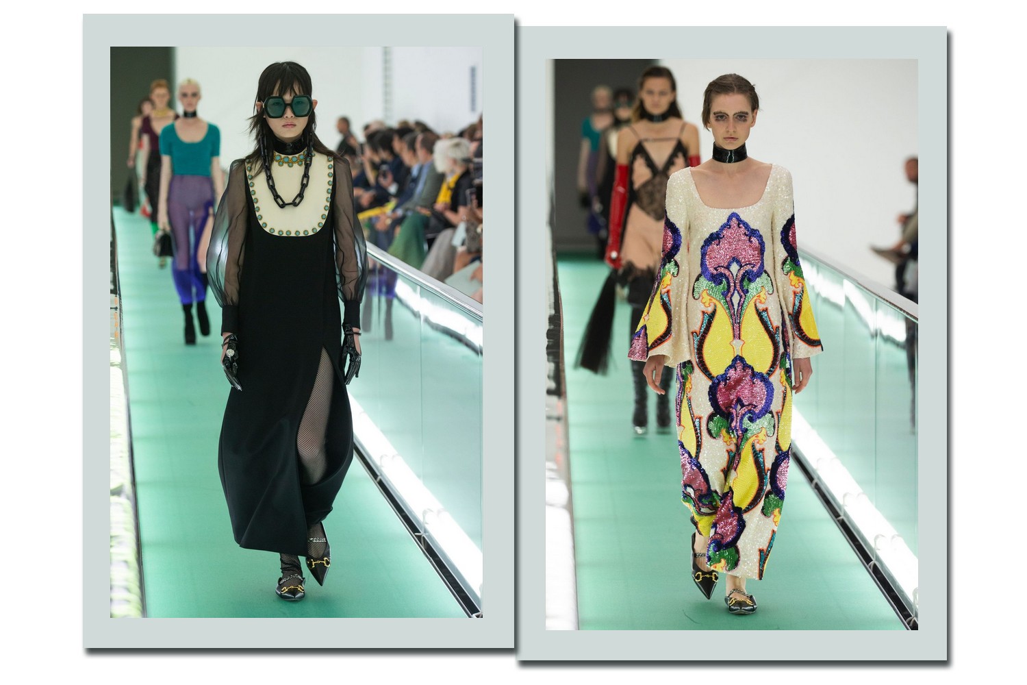 Para a noite, decotes ousados e fendas provam que a mulher Gucci não quer passar desapercebida.