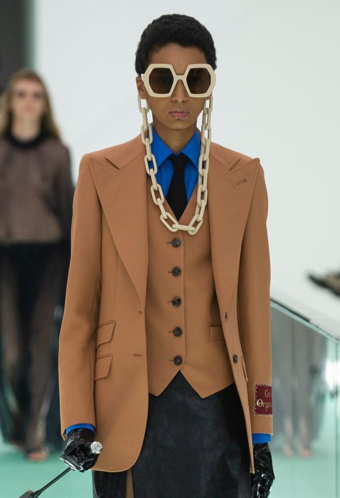 Depois de diversas coleções que ousaram pelas cores e misturas chamativas, Michele trouxe um momento mais sombrio para a Gucci, com diversos looks predominantemente pretos.