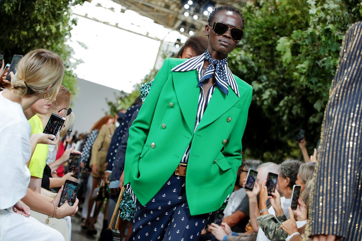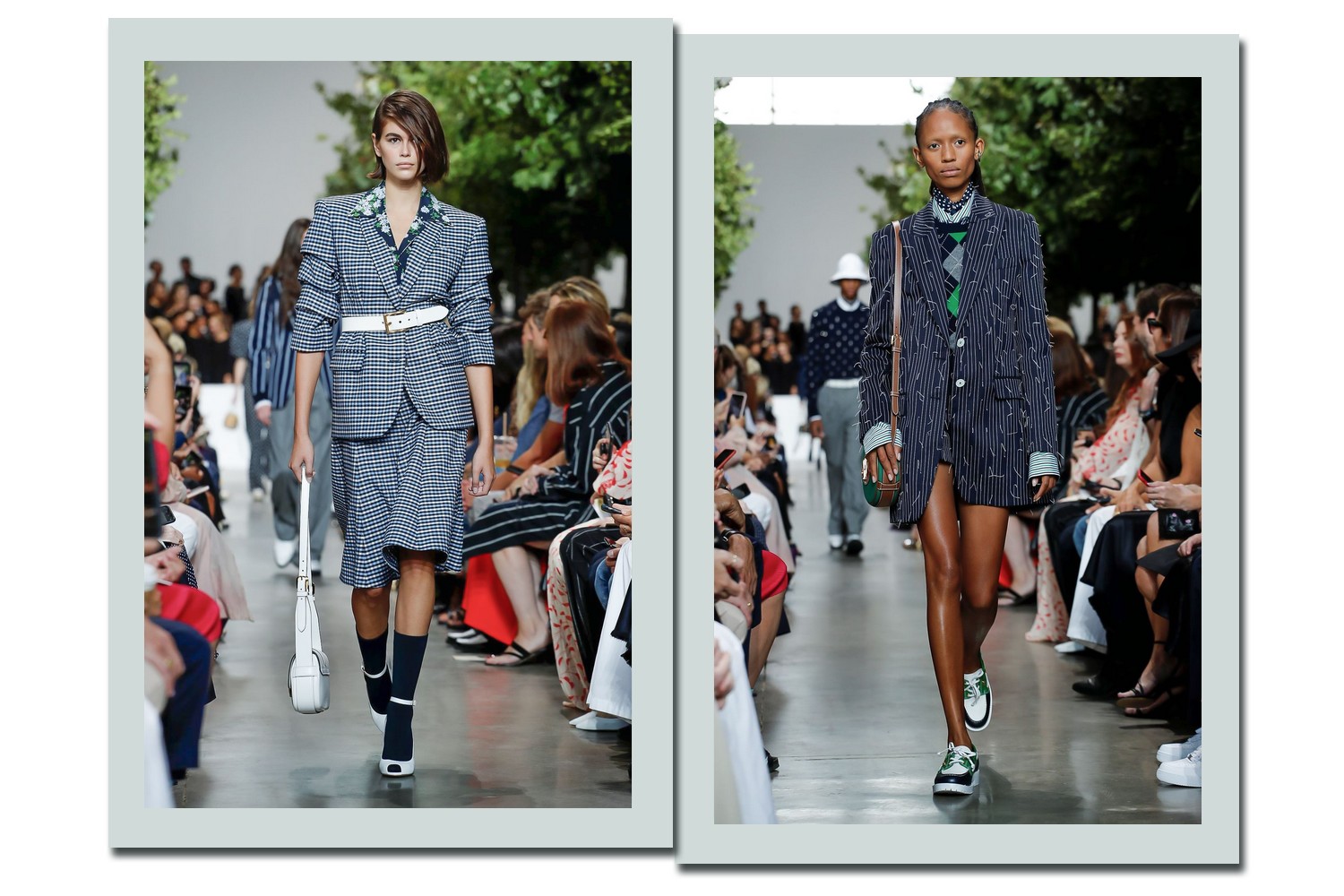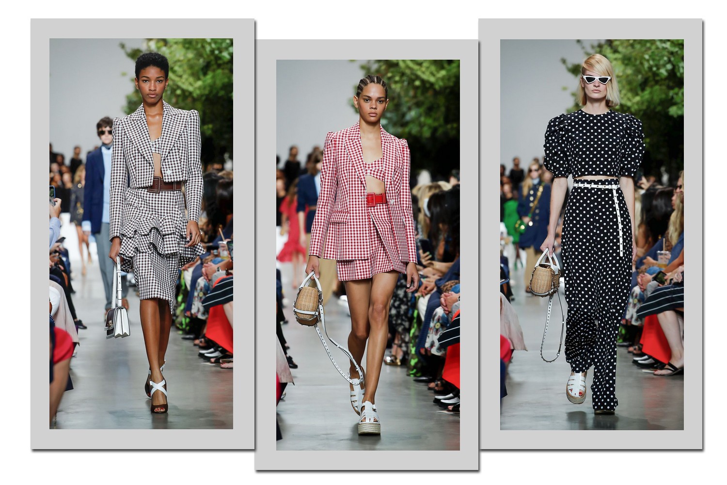 Ao lado do azul, o branco e o vermelho remeteram ao olhar otimista que o designer tem sobre os Estados Unidos, por meio de uma coleção de contrates, romântico e punk, mas sempre com muito brilho. Aplicações de estrelas, estampas de cerejas e o xadrez que lembra uma toalha de piquenique traduziram o “american way” na passarela. Veja dez coisas que amamos do verão 2020 da Michael Kors: