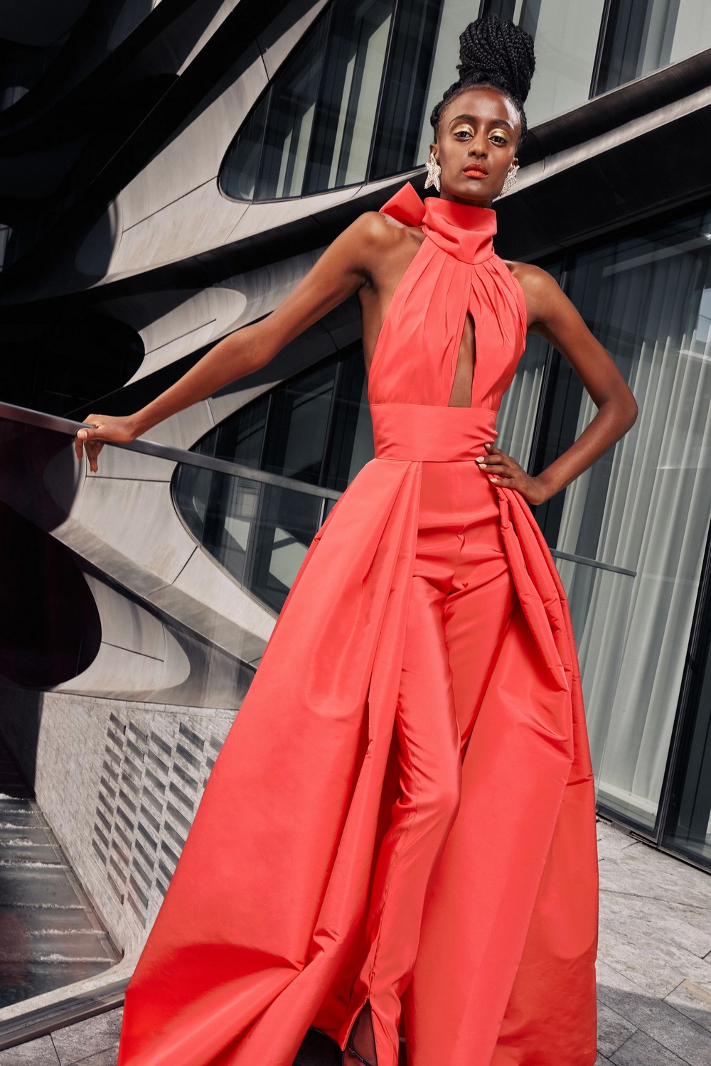 Esta peça se destaca pelos diferentes elementos que a compõem, incluindo a gola alta – com um laço na parte de trás, o recorte abaixo do busto, o tom de coral e a mistura do macacão com a cauda volumoso.