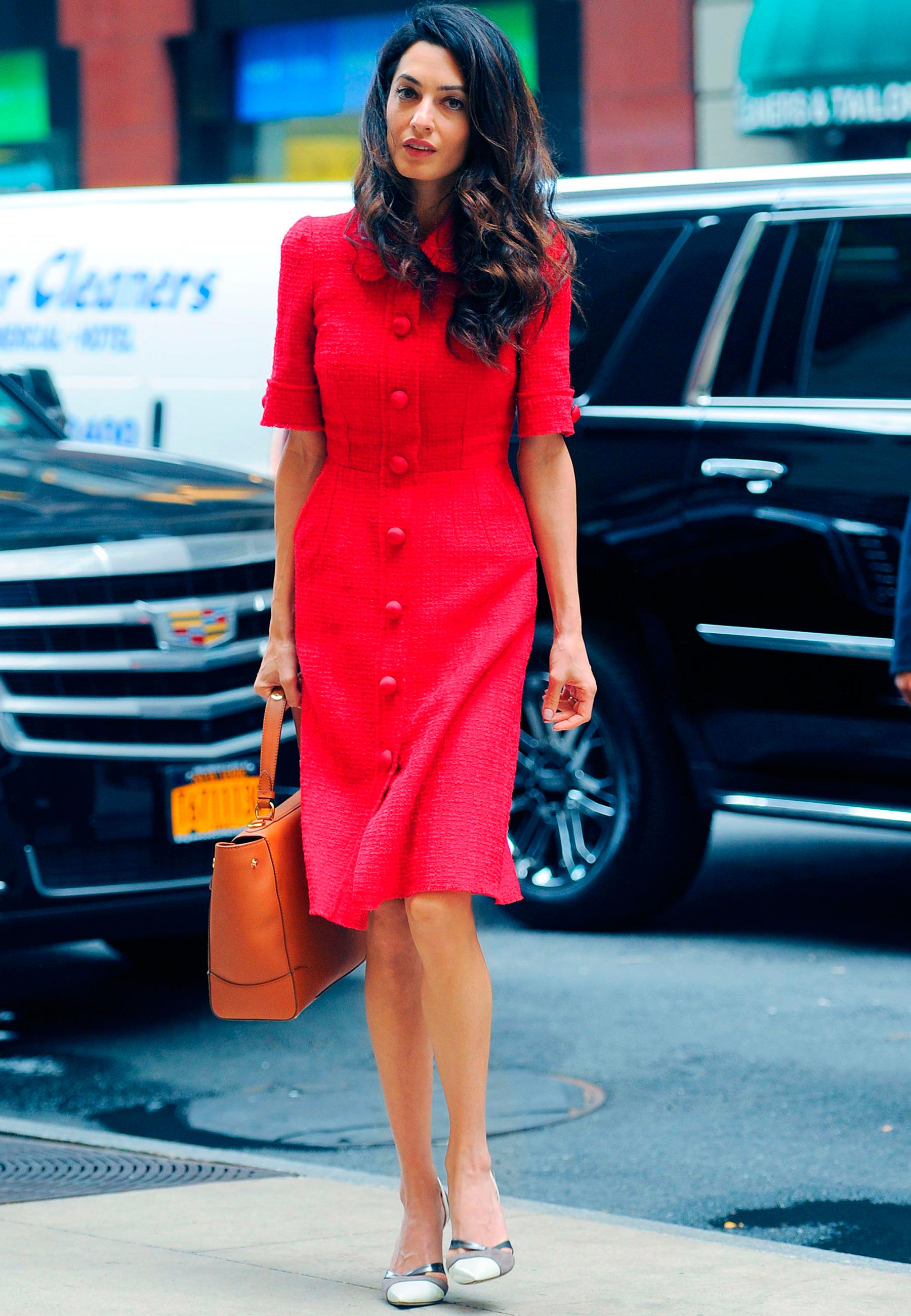 Mesmo que você não seja tão corajoso quanto Amal quando se trata de ter um guarda-roupa colorido, a advogada é a prova de que apenas um toque de cor pode fazer uma grande diferença. O laço vermelho neste vestido dá Gucci dá um acabamento sem esforço.