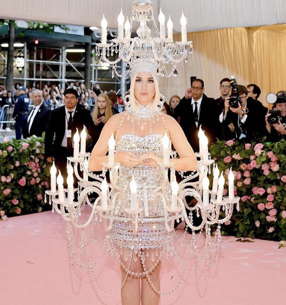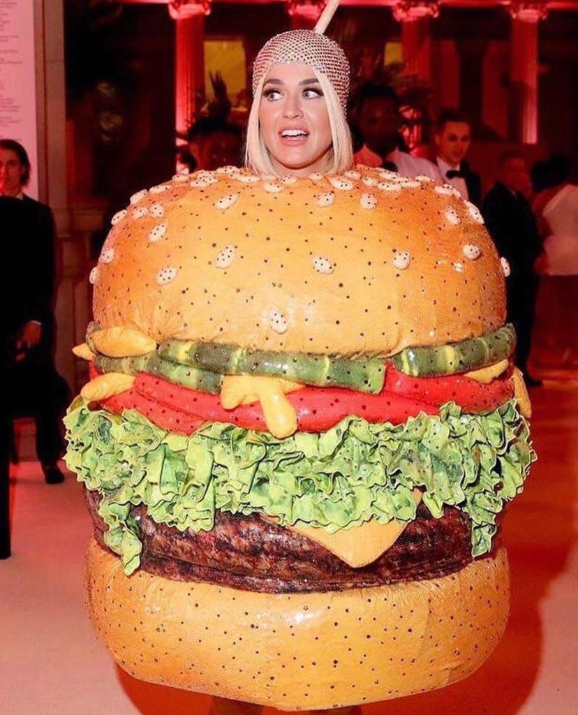 Sendo assim, Katy Perry escolheu o estilista Jeremy Scott e a Moschino para desenvolverem suas vestimentas. Sim, a cantora apostou em dois modelos: primeiro, um candelabro. Em seguida, um cheeseburger.