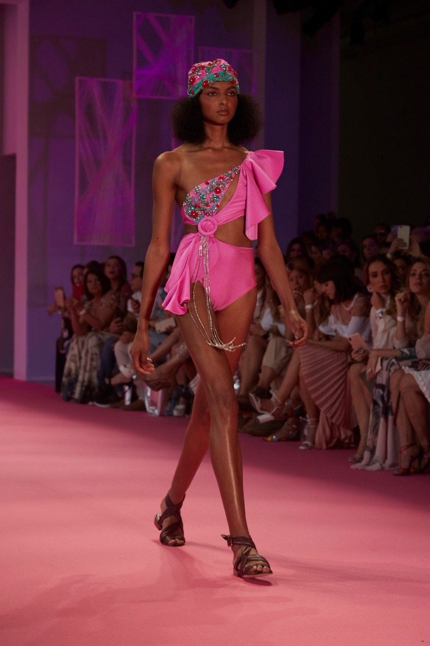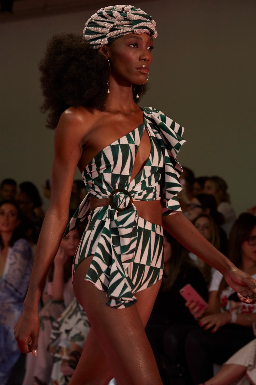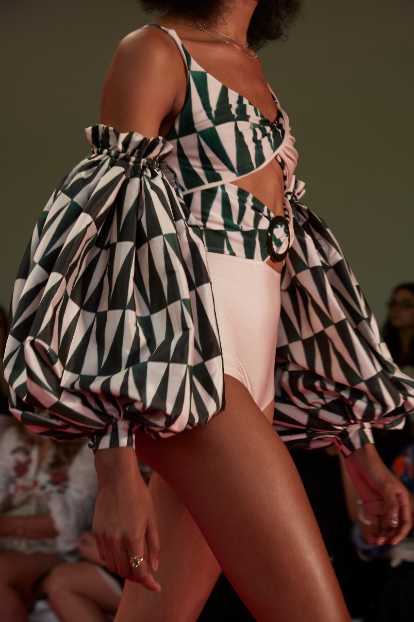 A proposta foi unir dois universos caros para a estilista: moda praia e festa. O resultado são bodies com mangas exuberantes, perfeitos para sunset parties, que dominaram quase todo o desfile.