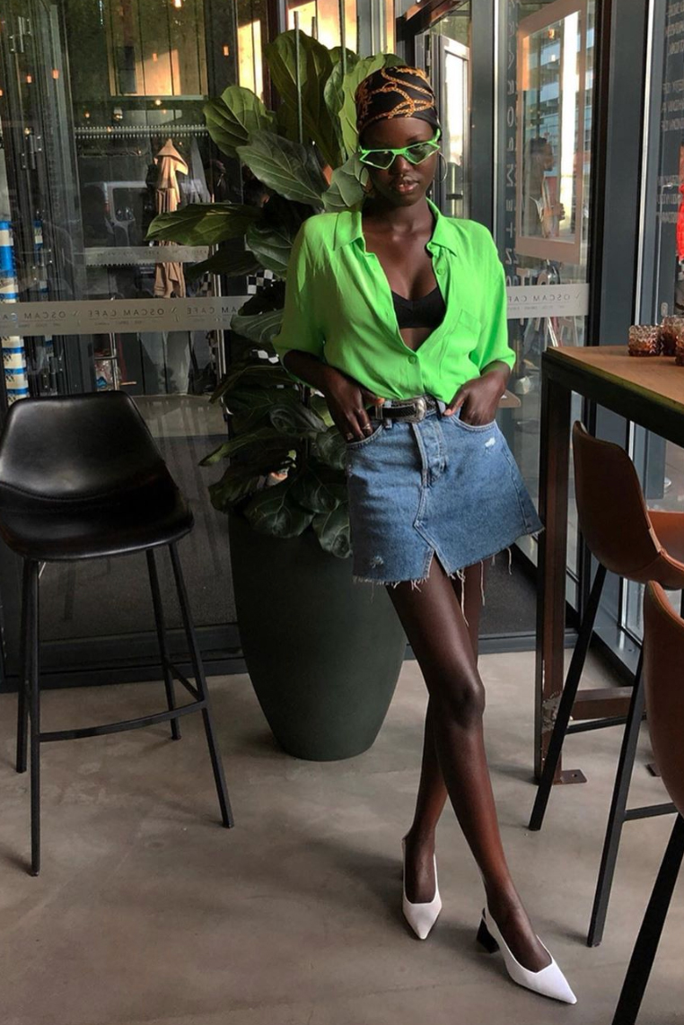 O segredo da primavera é abusar das cores! Principalmente, dos tons neon. Adut Akech aposta na camisa desabotoada, para criar a ilusão de decote em V, que alonga o visual.