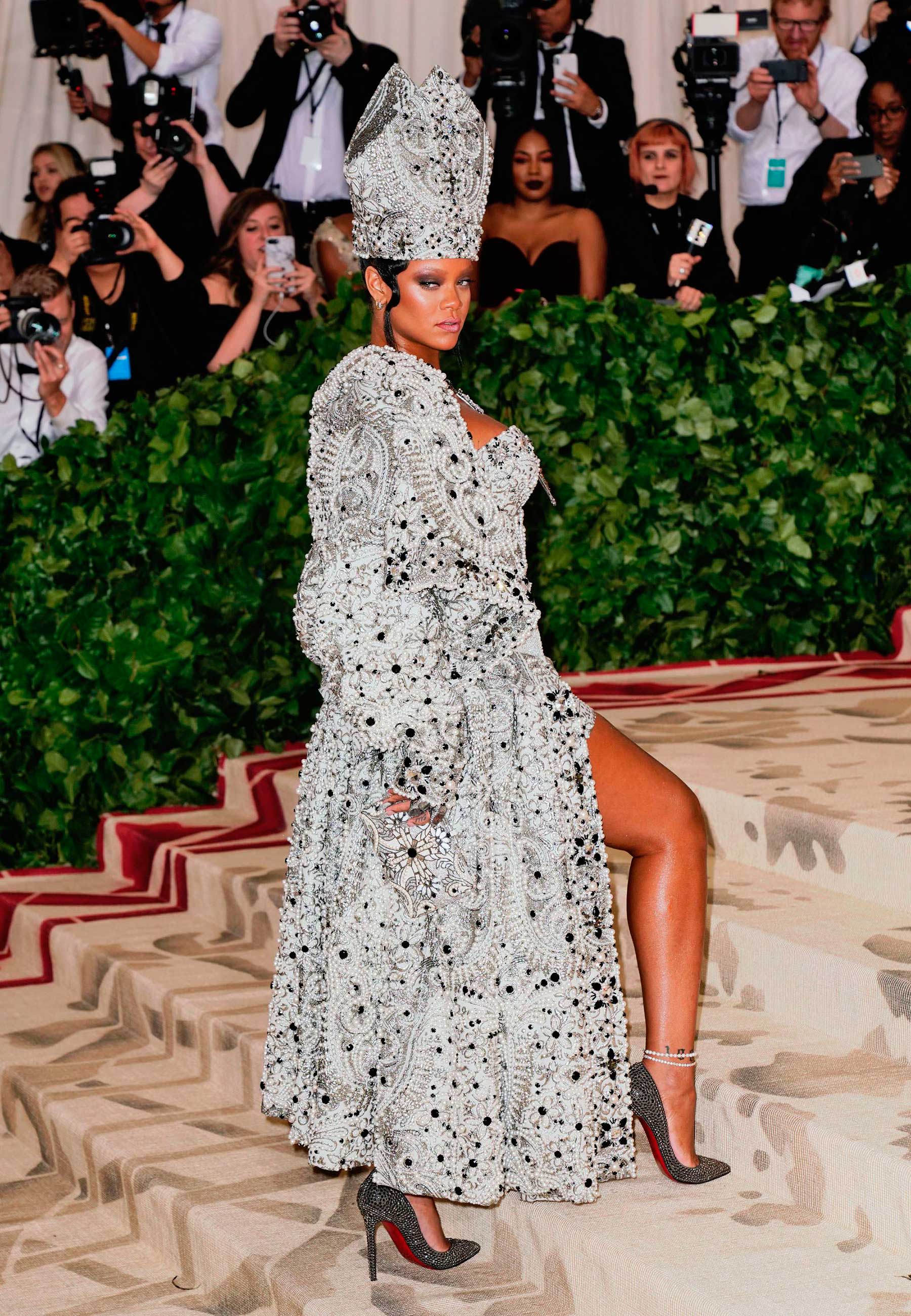 Rihanna causa no tapete vermelho com chapéu de bispo