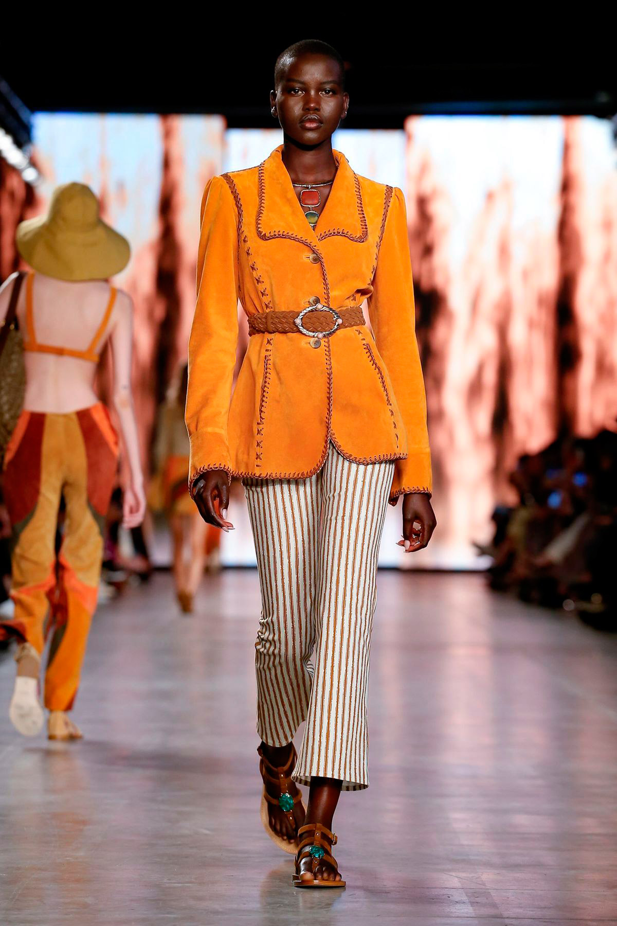 Alberta Ferreti dá uma pegada cowboy para a estação, com acabamento de pesponto e um cinto arrematando o look.