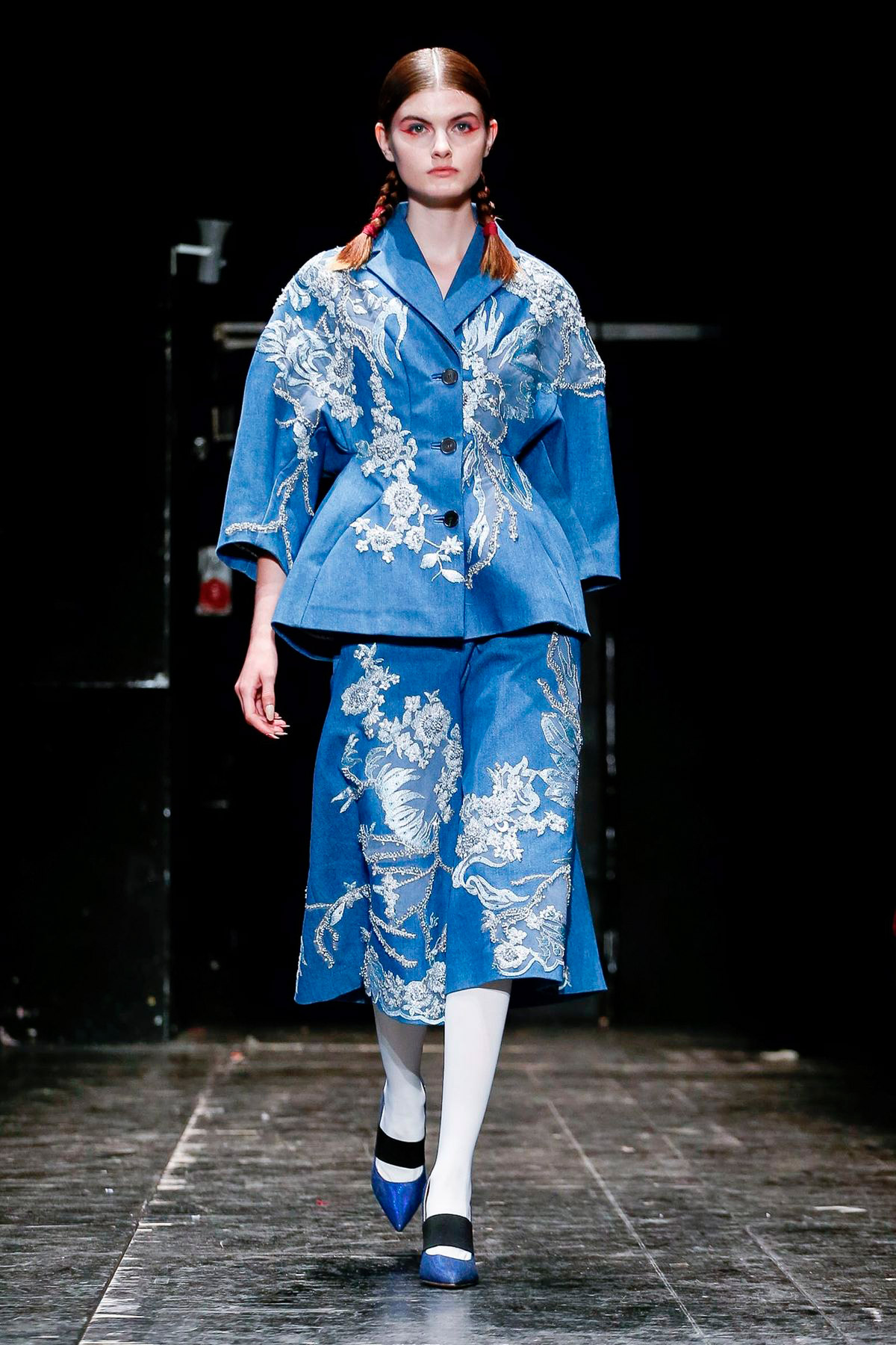 O blazer jeans ganha ombros arredondados na passarela da Philosophy Di Lorenzo.