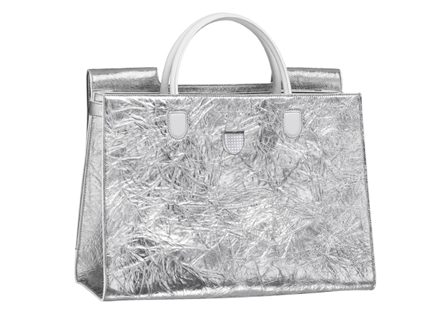 3 / 3A bolsa Diorever, a nova it-bag da grife, que surge nessa coleção e será continuada nas próximas com diferentes tamanhos e acabamentos. Segundo Cicila, sua preferida é a prata metálica – Foto: divulgação