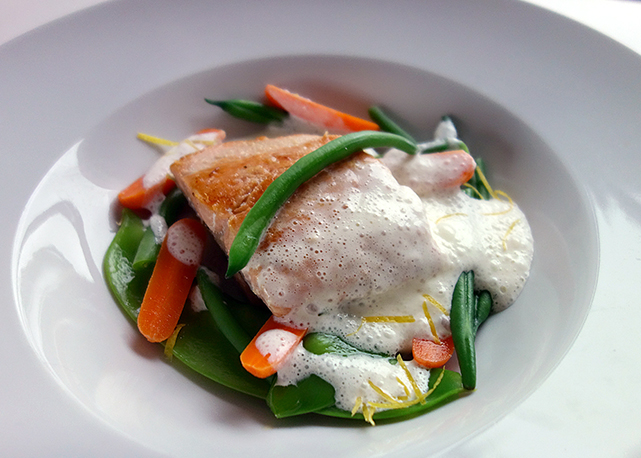 Coloque uma porção de legumes salteados no prato, o filé de salmão no centro e finalize com a espuma.