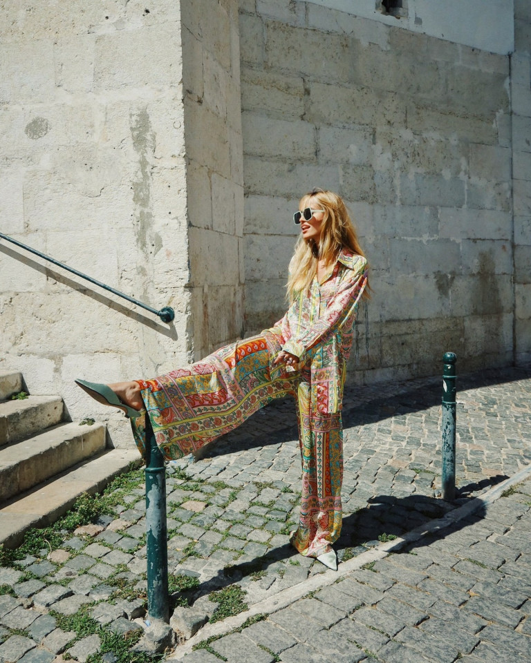 Outra opção é apostar em conjuntos com a mesma padronagem , como o clássico paisley, ou cores vibrantes que remetem ao espírito boêmio. Neste caso, corte refinado e acessórios minimalistas adicionam um toque sofisticado. O contraste entre o ar descomplicado do look e a atitude glam da pose mostra como o boho não precisa ser óbvio: pode ser urbano e contemporâneo ao mesmo tempo.