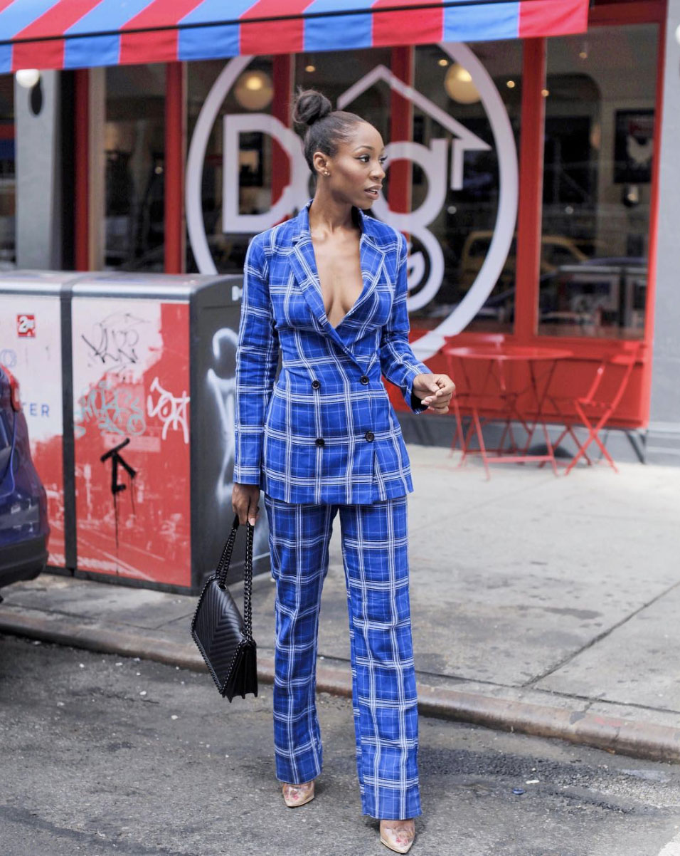A Chinyere Chi-Chi Adogu abusou do xadrez azul na combinação blazer e calça. O coque para fechar o visual proporcionou elegância, em contraste com o decote profundo em V.