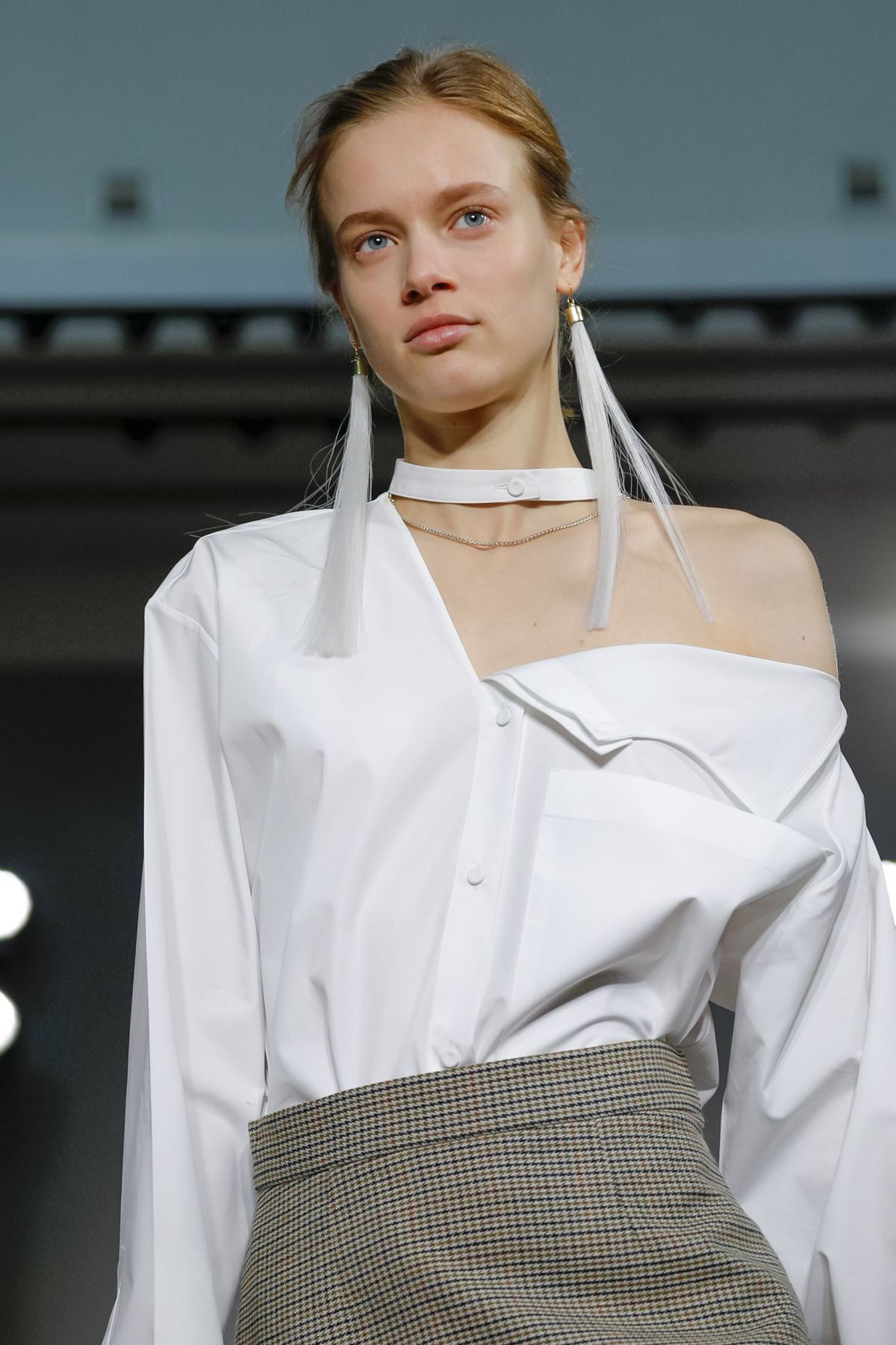Por exemplo, na foto acima, a Ports 1961 escolheu arrematar a camisa desconstruída com uma choker de algodão, parte da própria peça de algodão.