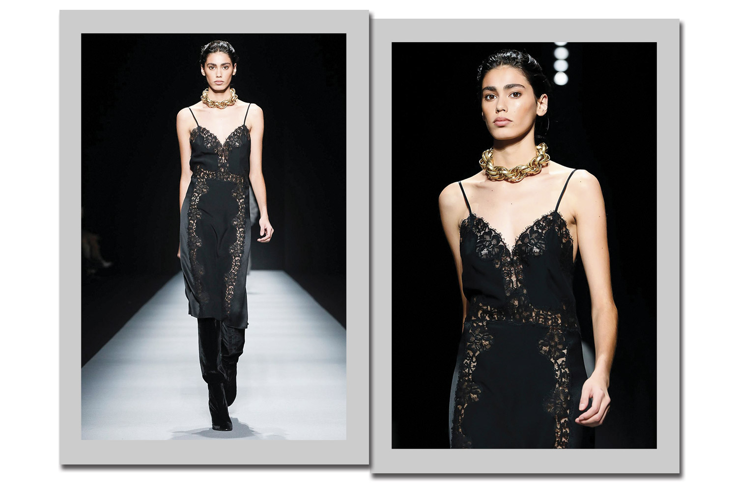 Peça-símbolo dos anos 1990, eternizado por Kate Moss, o slip dress de Alberta para 2020 ganha um twist com os detalhes de renda vazados, e usado com bota de cano longo. Muito cool.