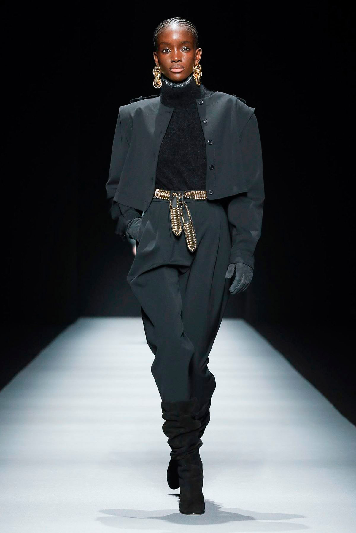Mica Argañaraz abriu o desfile de forma plena, com um look all black que carrega todos os elementos que veremos mais tarde na passarela: o couro, o babado (na gola), as ombreiras e a calça semibaggy, tão popular nos anos 1980, e que está de volta.