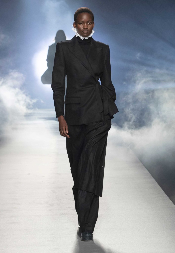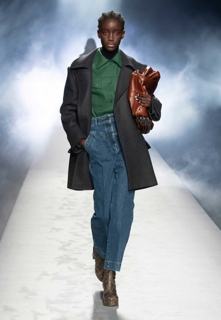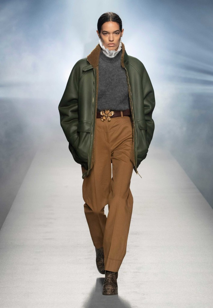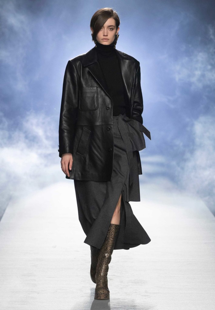 Uma coleção pé no chão: Alberta Ferretti apresenta uma coleção de inverno 2021 minimalista e atemporal. A linha é marcada pelos separates: casacos, blazers, bombers e camisas de couro são usados com calças de alfaiataria, jeans e saias sempre longas. A paleta é escura, com muito preto e apenas toques de oliva, azul escuro e mostrada.