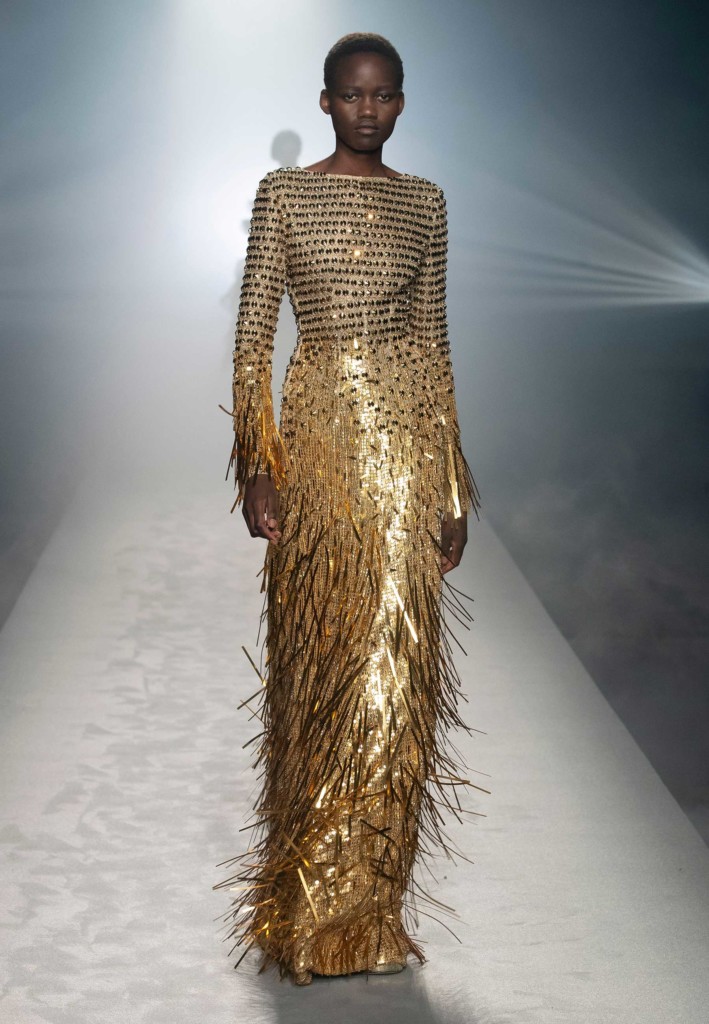 Mas a estilista deixa seu registro para as festas para o final (quando elas voltarem, claro), com uma série de dourados com franjas e vestidos de tule. Vale destacar que até estas peças são usadas com botas ou coturnos.