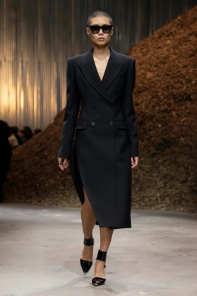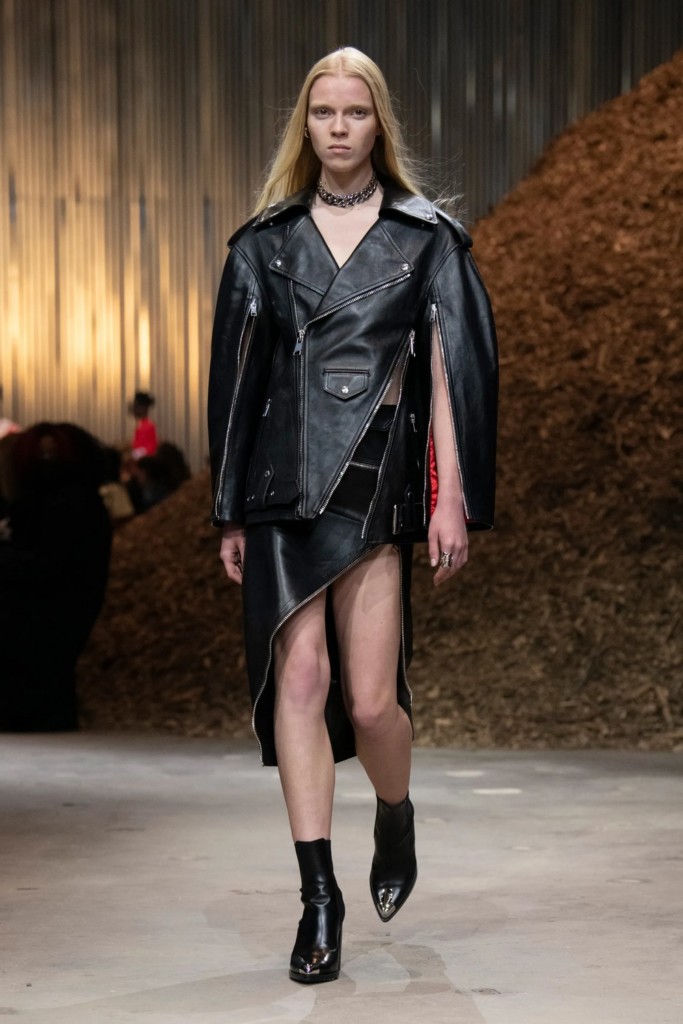 Para marcar o equilíbrio tão desejado da marca entre a natureza e o tecnológico, a alfaiataria acrescenta um toque menos natural à coleção. O couro, as peças bordadas e o acabamento metalizado destacam a força sempre presente na Alexander McQueen. Os recortes – que criam diferentes sessões nos blazers -, as fendas – que arredondam um sobretudo – e as sobreposições – como na calça que ganha uma camada de saia – chama a atenção ao longo do desfile.