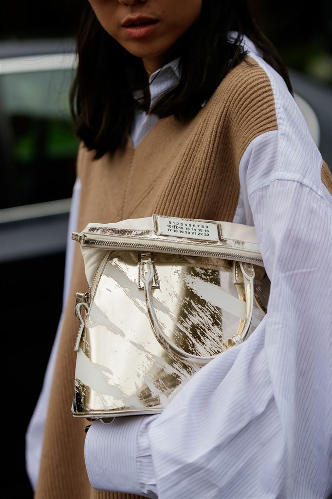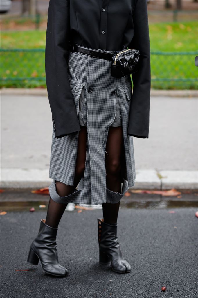 No melhor do estilo Margiela, a saia de pied de poule é na verdade uma parte de um trench coat. Os recortes aparecem de forma rasgada, fazendo a vez da fenda. Para equilibrar o visual, a camisa all black com mangas de blazer também mostra o estilo híbrido, que completa o estilo.