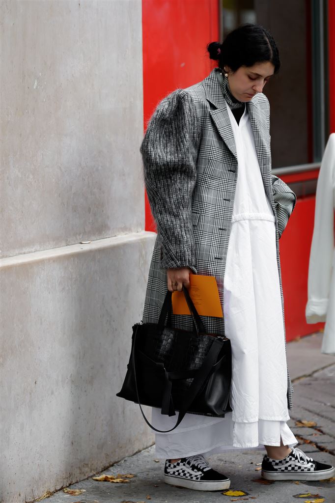 Aqui, são as mangas que constroem o mood: bufantes em um trench coat de corte reto, o tecido foi desfiado, transformando a estampa xadrez.