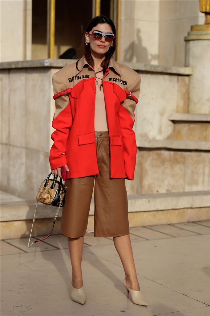 Já como a Off-White, de Virgil Abloh, o blazer acima também é uma mistura entre peças. O vermelho é o contraste perfeito para o tom camelo, que é um clássico da elegância fashionista. A costuras são aparentes, porém mais bem acabadas do que costumamos ver no estilo desconstrutivista.