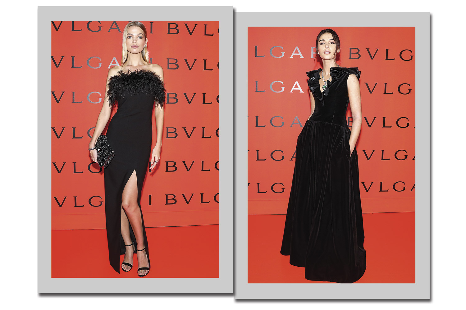 Um pouco de volume: à esquerda, Daphne Groeneveld arrasa com as plumas na região do decote, complementado pela fenda poderosa. À direita, Naomi Scott aposta no longo com bolso e babados na gola, do estilista Prabal Gurung.